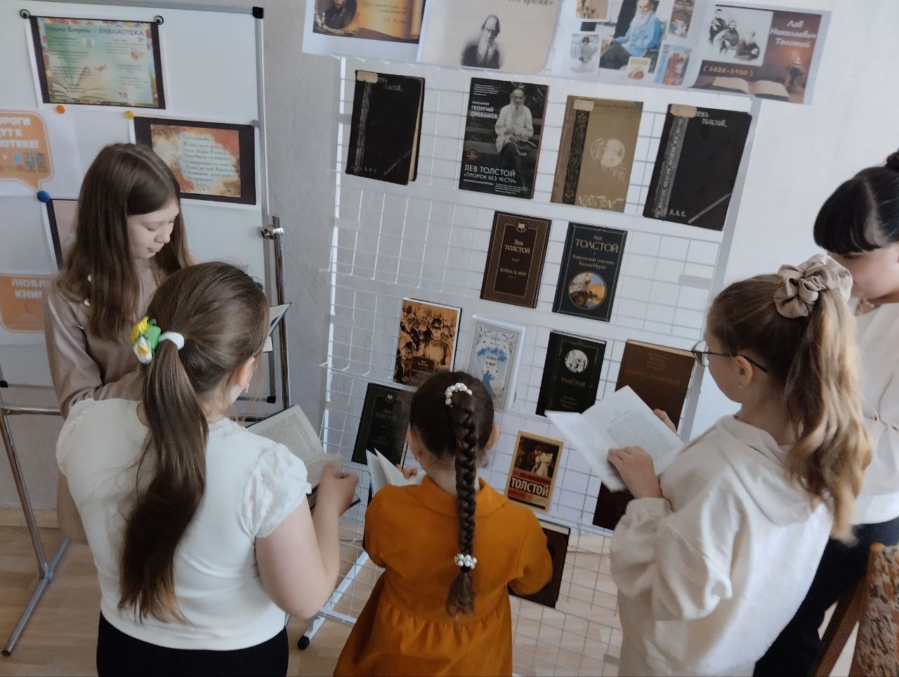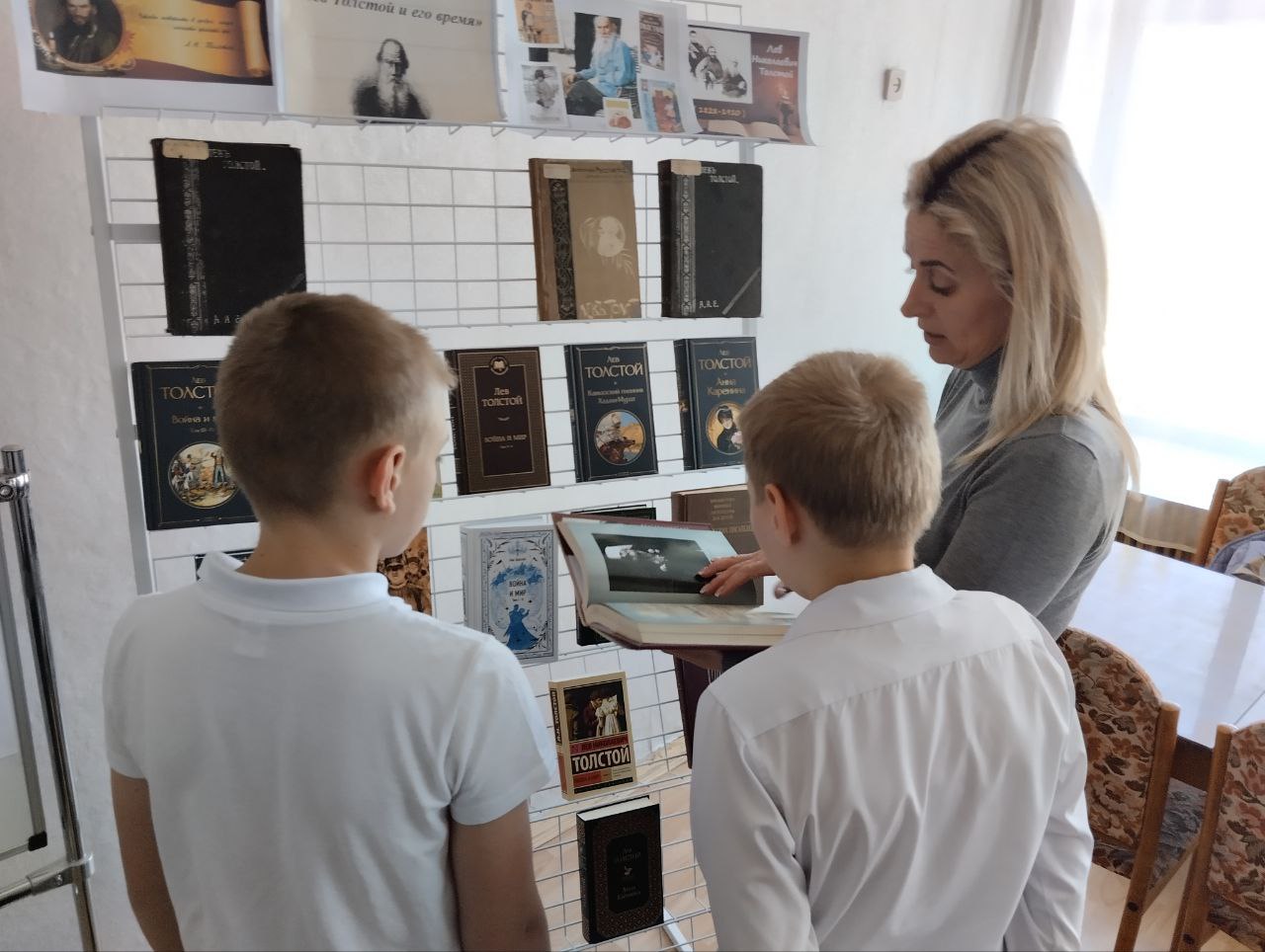⭐️Херсонская областная универсальная научная библиотека провела для старших классов Новотроицкого общеобразовательного учреждения №2 книжную выставку, посвященную 200-летия со Дня рождения Льва Николаевича Толстого.